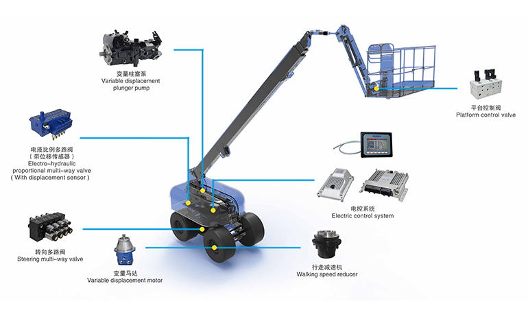 3. 實(shí)現(xiàn)整車(chē)行駛與轉(zhuǎn)向、臂架變幅伸縮、轉(zhuǎn)臺(tái)回轉(zhuǎn)、平臺(tái)自動(dòng)調(diào)平等動(dòng)作,無(wú)級(jí)調(diào)速,啟停平順、響應(yīng)迅速、動(dòng)作平穩(wěn)、微動(dòng)性好。